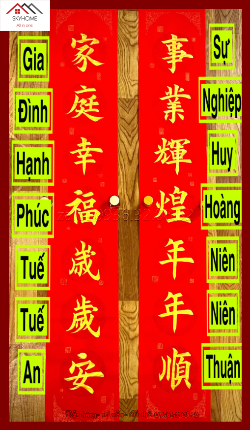 Một trong những câu đối được trình bày là: “Sự nghiệp huy hoàn niên niên thuận, Gia đình hạnh phúc tuế tuế an”, nhấn mạnh lời chúc cho sự nghiệp thuận lợi, thành đạt và gia đình bình an, hạnh phúc theo năm tháng.
