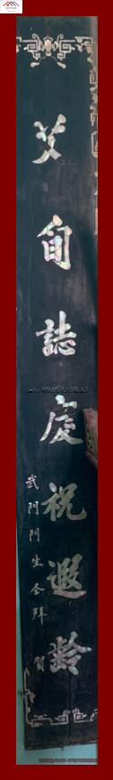 Câu thứ hai, “艾旬誌慶祝遐齢” (Ngải tuần chí khánh chúc hà linh), mang ý nghĩa lễ mừng thọ hoặc chúc phúc kéo dài.