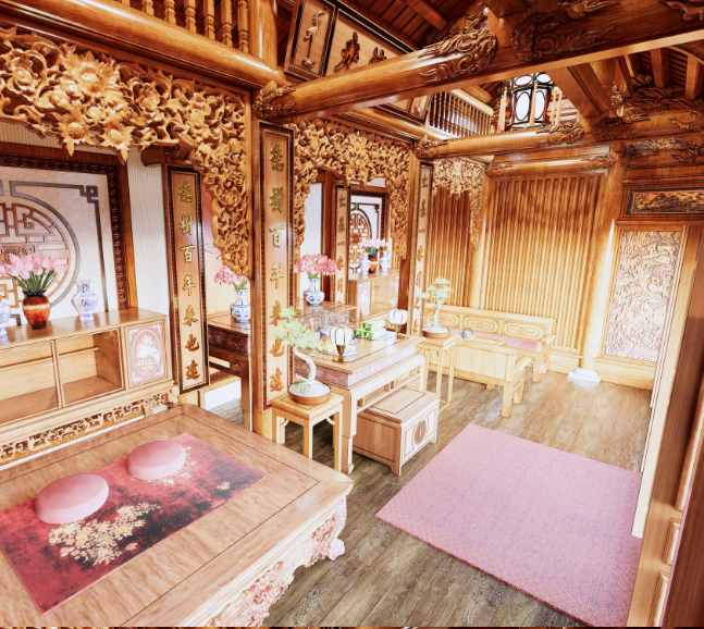 Trả lời: Nhiều người nhận xét gian thờ phỏng dựng rất tinh tế, thể hiện sự chuẩn mực trong bố trí và kiến trúc. Không gian được dựng lại mang đậm phong cách cổ điển, tạo cảm giác trang nghiêm, tĩnh tại. Dù chỉ là phỏng dựng, từng chi tiết từ ánh sáng, màu gỗ đến các vật thờ đều toát lên sự hài hòa, phản ánh rõ nét văn hóa thờ cúng truyền thống của người Việt.