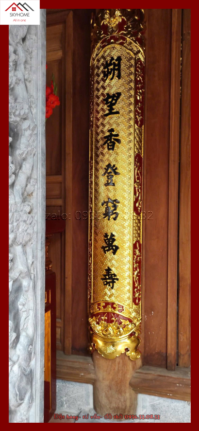 - Vế trên: Sóc vọng hương đăng cùng vạn thọ (朔望香燈恭萬壽) – nghĩa là: “Ngày mồng Một và ngày Rằm, dâng hương đèn suốt đời, suốt kiếp, kính chúc thọ dài lâu.”