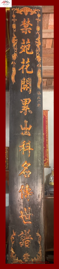 Phiên âm: Cấm uyển hoa khai luỹ xuất khoa danh truyền thế phả, nghĩa là: “Hoa nở trong vườn cấm, đời đời xuất hiện người đỗ đạt, gia phả được truyền mãi qua thế hệ.”