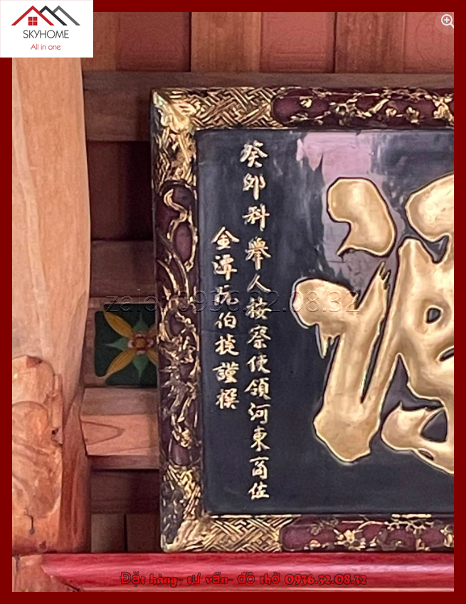 Bức hoành phi cổ mang dòng chữ “Ẩm Hà Tư Nguyên” (饮河思源) mang ý nghĩa giáo dục sâu sắc: “Uống nước nhớ nguồn”, nhắc nhở con cháu luôn biết ơn và tưởng nhớ công lao của tiền nhân, tổ tiên. Đây là một câu tục ngữ được các cụ xưa dùng để truyền dạy đạo lý hiếu nghĩa, nhấn mạnh mối quan hệ giữa quá khứ và hiện tại, giữa thế hệ đi trước và thế hệ kế thừa.