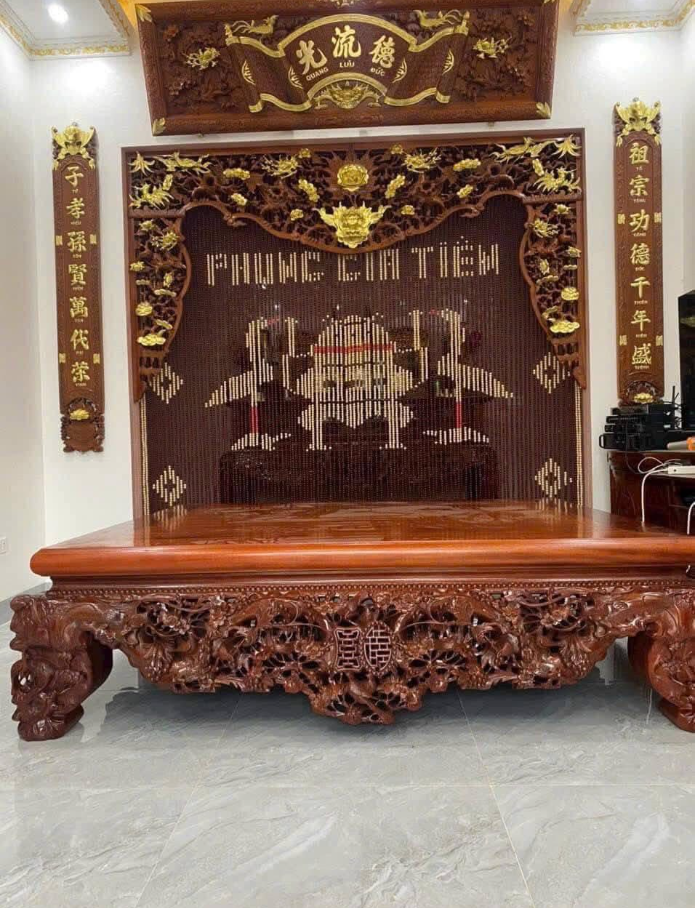Kích thước bàn thờ cũng ảnh hưởng đến phong thủy và thẩm mỹ. Một mẫu phổ biến dài 2,35m, sâu 1,27m, cao 1,27m sẽ phù hợp với hầu hết không gian gia đình, đảm bảo uy nghiêm, cân đối. Chân bàn kiểu cưỡi nghê tạo cảm giác mạnh mẽ, trang trọng. Chọn bàn thờ đúng kích thước giúp không gian thờ cúng hài hòa, đầy đủ mà vẫn gọn gàng.