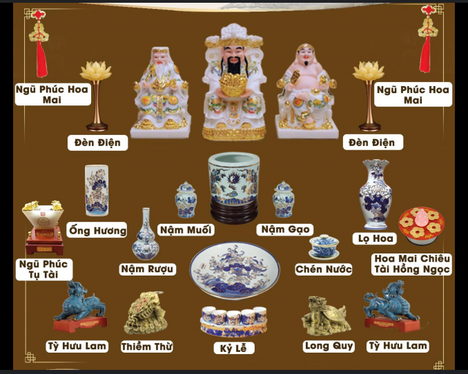 Trên bàn thờ Thần Tài, tượng Thần Tài được đặt bên trái, tượng Thổ Địa bên phải nhằm thu hút tài lộc và bảo vệ gia đình. Tượng Phật Di Lặc đặt ở vị trí cao nhất để xua đuổi điều xấu mang lại bình an và hạnh phúc. Các vật phẩm cúng gồm có gạo, muối, hũ nước đầy, hoa tươi như hoa hồng, hoa cúc, hoa đồng tiền, mâm ngũ quả và lọ hoa trang trí. Cúng lễ Thần Tài được thực hiện thường xuyên, đặc biệt vào ngày mùng 1, ngày Rằm và ngày mùng 10 tháng Giêng để cầu tài lộc.