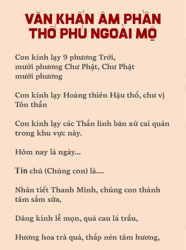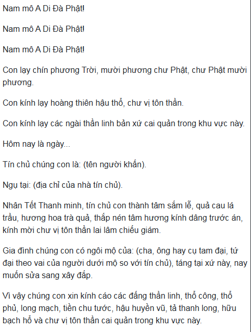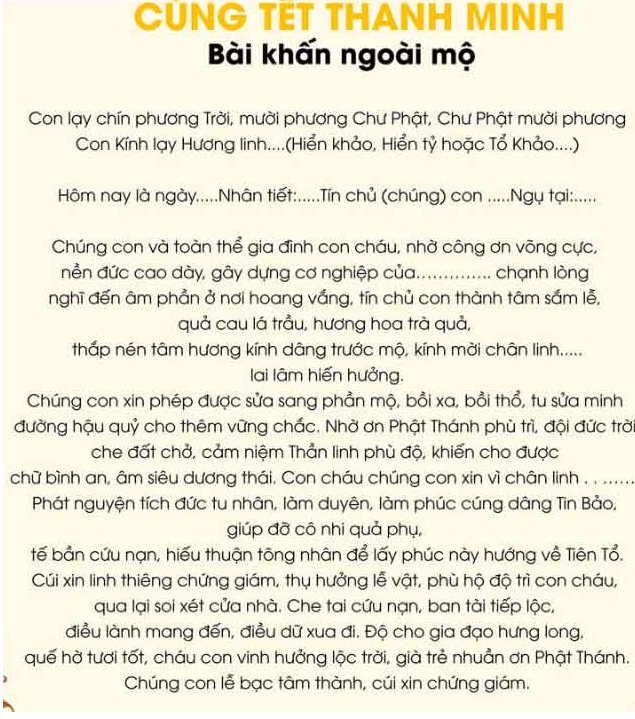 Trả lời: Văn bản có thể làm nền tảng cho nhiều dịp lễ truyền thống, không chỉ ngày Thanh minh. Khi được đọc bằng lòng thành, hiểu đúng ý nghĩa, nghi lễ trở nên trang nghiêm và linh ứng, góp phần bảo tồn phong tục và tín ngưỡng cổ truyền Việt Nam.