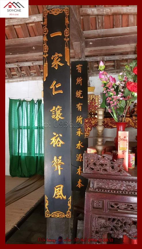 Hai câu đối đi kèm được viết bằng chữ Hán cổ, có nội dung: